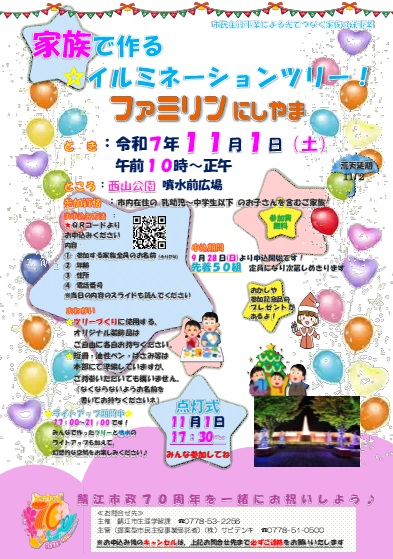 令和7年11月1日(土)今年も西山公園で「ファミリンにしやま」 家族でつくるイルミネーションツリーを行います。 今年は鯖江市政70周年です。 一緒にお祝いしまし…
